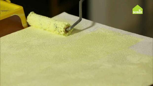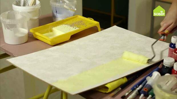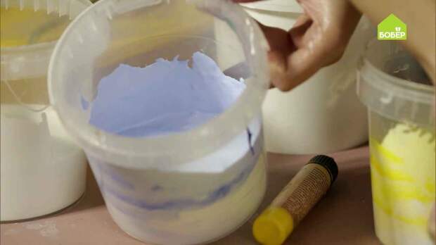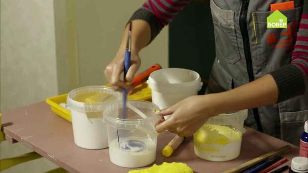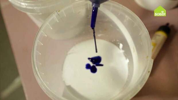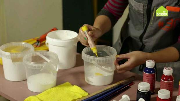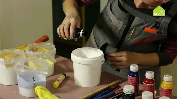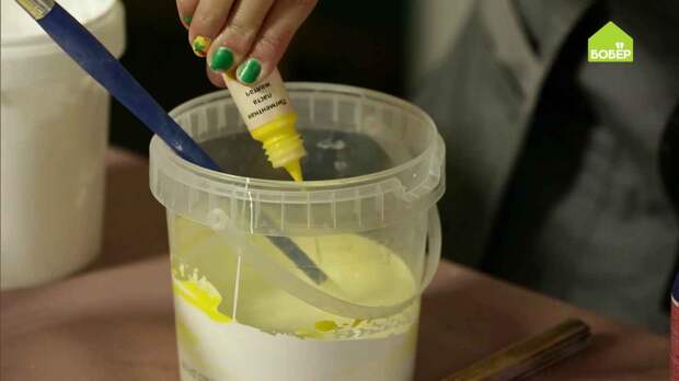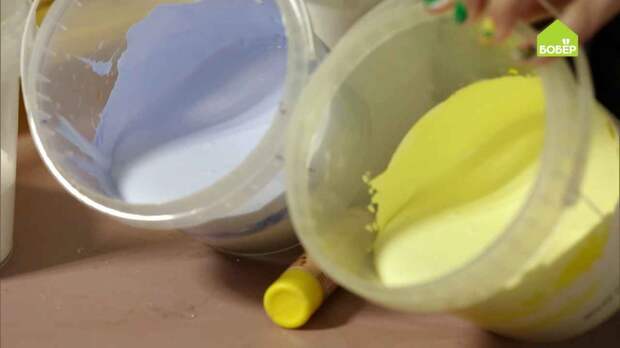 Возьмите нужный колер (в нашем случае жёлтый и голубой) и постепенно добавляйте его в краску. Если необходимо получить более яркий оттенок, добавьте ещё несколько капель колера. Для большего удобства колер может быть упакован в шприц с дозатором. Такой краской можно покрыть как декоративно-отделочные покрытия, так и просто стену и даже обои.
