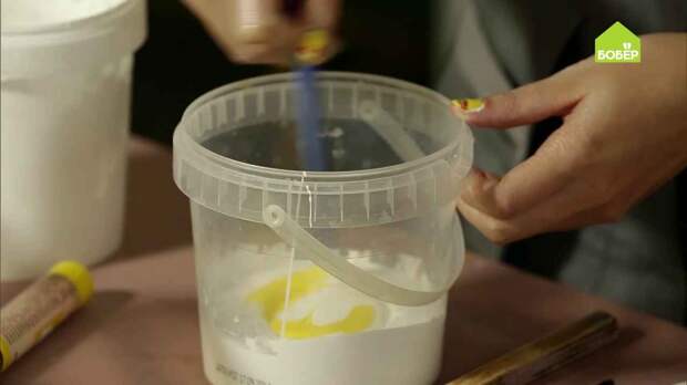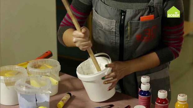 Колеровать можно как водоэмульсионные и водно-дисперсионные краски, так и любой отделочный материал — шпатлёвку или штукатурку. Если материал густой, для равномерного размешивания понадобится строительный миксер, если нет, вполне подойдёт деревянная палочка.