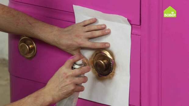 Покрасьте ножки, ручки и замочные скважины комода аэрозольной краской золотого цвета. Во время работы используйте трафарет.