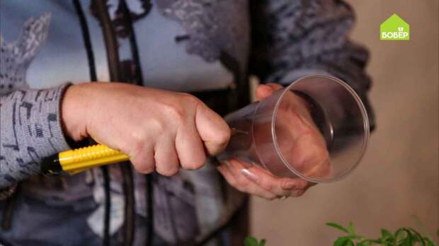 Возьмите пластиковый стакан и, чтобы низ черенка был постоянно под воздействием воздуха, сделайте большие прорези с помощью канцелярского ножа.