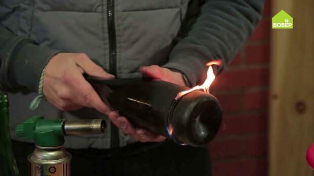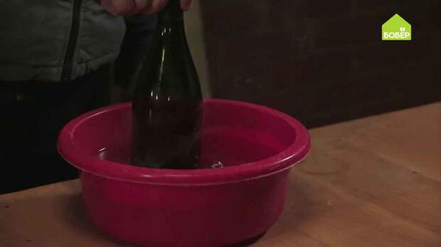 Когда нить закончила гореть, быстро опустите бутылку в холодную воду, подождите некоторое время и отделите дно.