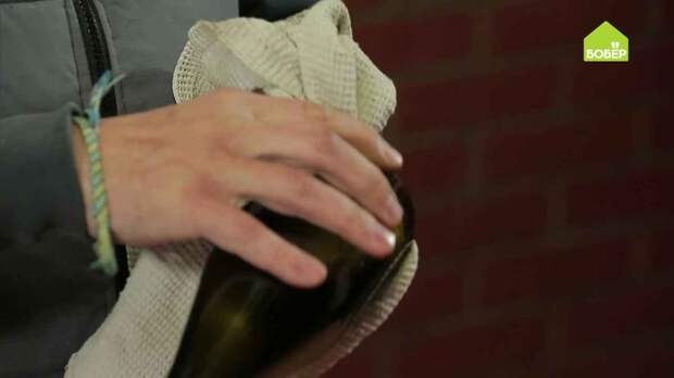 Вытрите бутылку от следов горения, а чтобы кромка не была острой, заточите её на шлифмашинке.