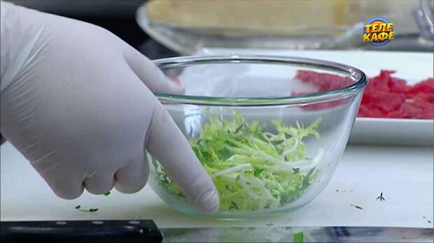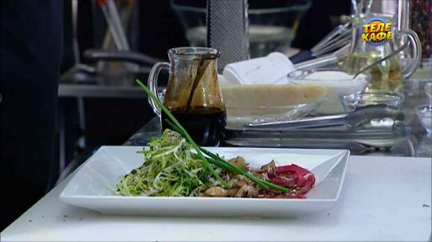 Тщательно перемешайте салат и выложите горкой на край тарелки.