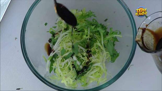 Полейте салат бальзамическим уксусом со вкусом инжира и оливковым маслом.