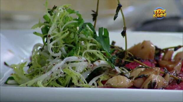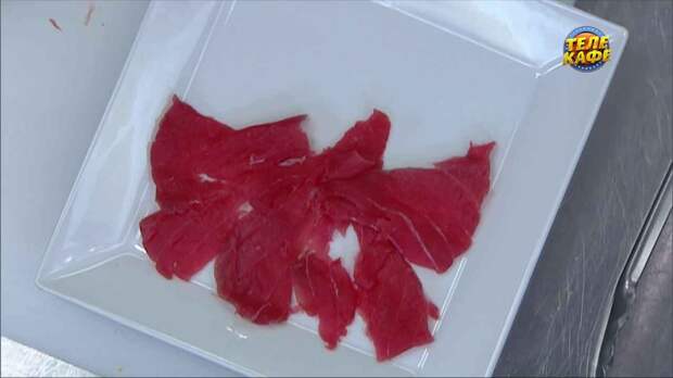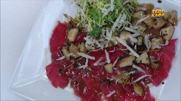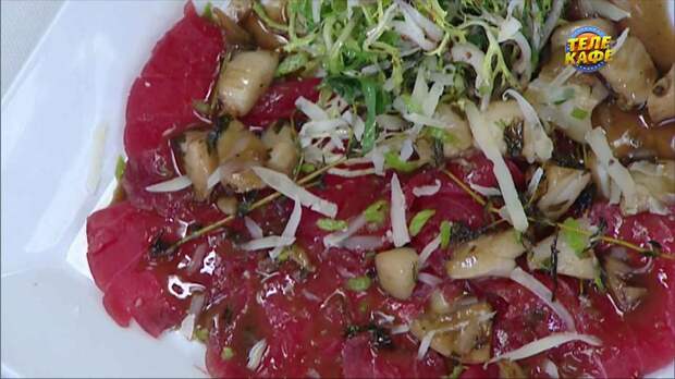 Сбрызните карпаччо бальзамическим уксусом со вкусом инжира и украсьте луком-сибулетом.