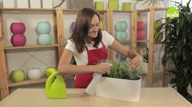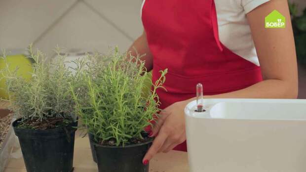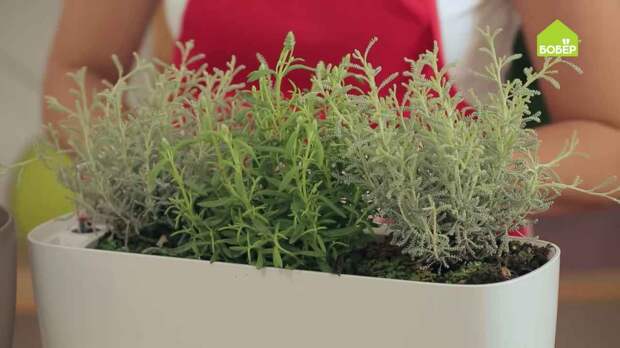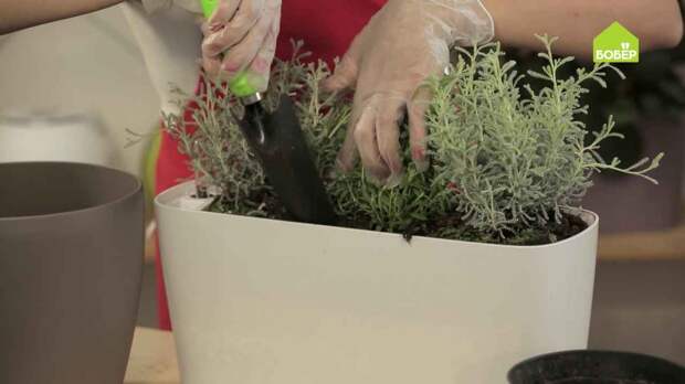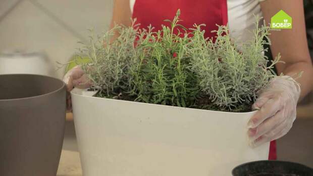 Вытащите растения из горшков и установите на дренаж. В данном случае выбраны тмин и стэхадская лаванда.