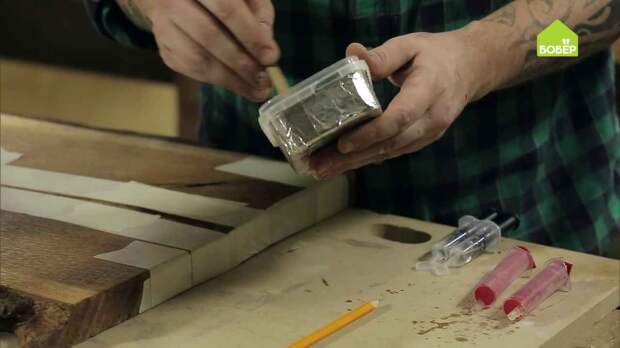 Когда смола начнёт нагреваться, быстро заполните ей трещину в столешнице, в противном случае пластиковая тара расплавится.