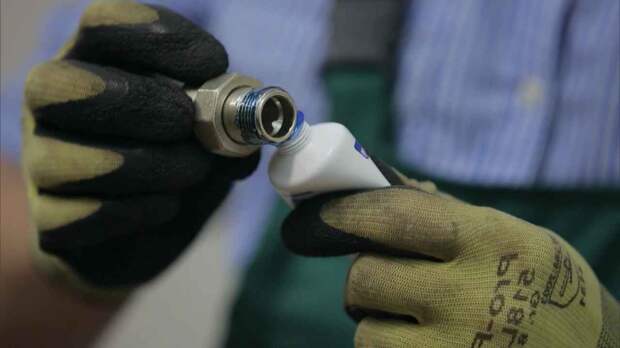 На резьбу нанести клей-герметик, предварительно встряхнув его.