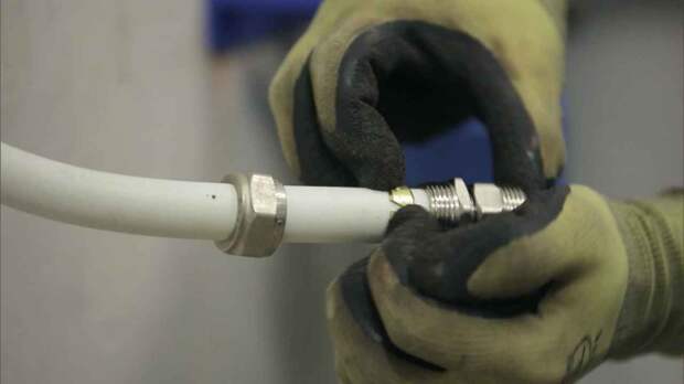 Для соединения трубы с фитингом накрутить накидную гайку, затянуть сначала от руки, затем ключом.