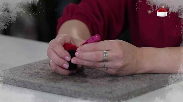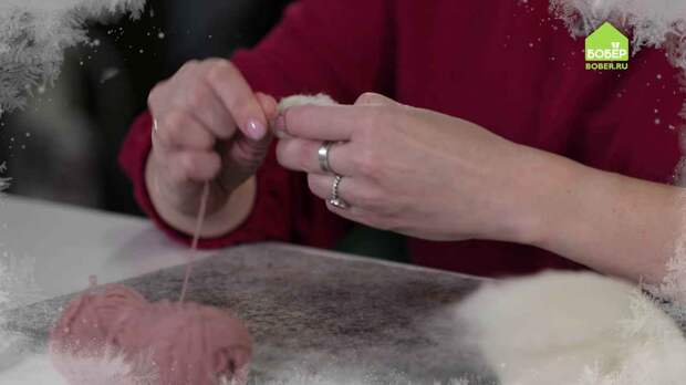 Из белой шерсти скатайте шарик размером с мячик для пинг-понга и обвяжите его ниткой.